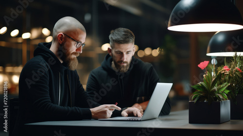 Serious entrepreneurs in black hoodies working at night in a big space