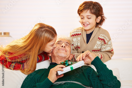 Mädchen küsst Opa mit Geschenk an Weihnachten