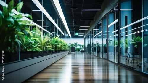 Modern glass office building interior with natural sunlight creating a bright and open atmosphere