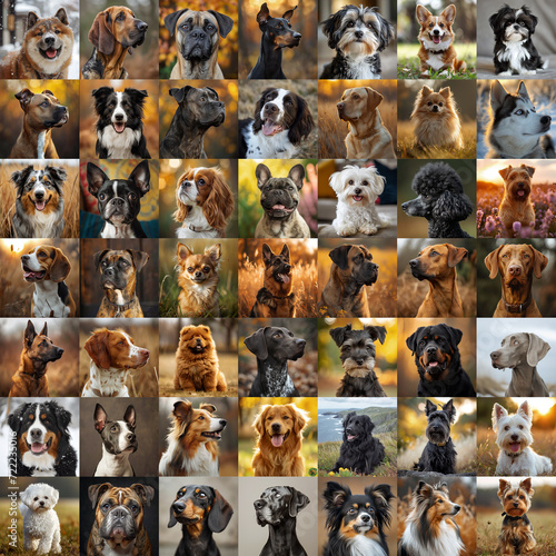 Portrait collage of many different happy dogs outdoors