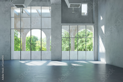 Modern minimalist interior with concrete walls and large floor-to-ceiling windows