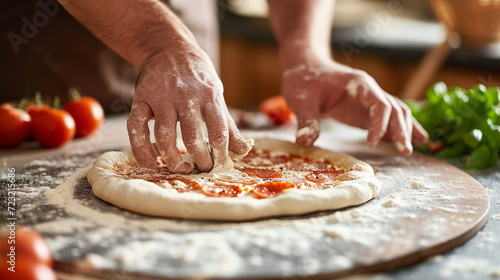 Hands of Italian chef preparing pizza on wooden board for cooking in pizzeria