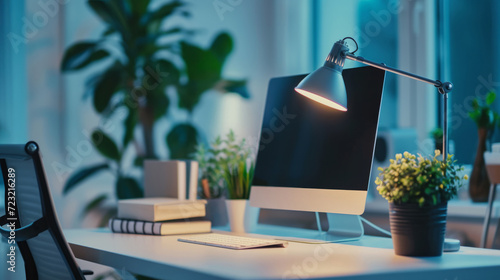 Desk Lamp providing reading light on desktop workspace with computer monitor