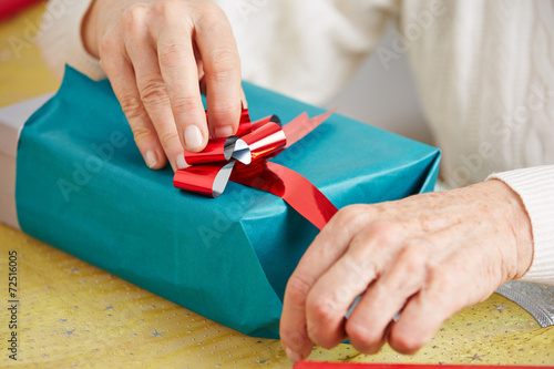 Seniorin verpackt Geschenk mit Schleife zu Weihnachten