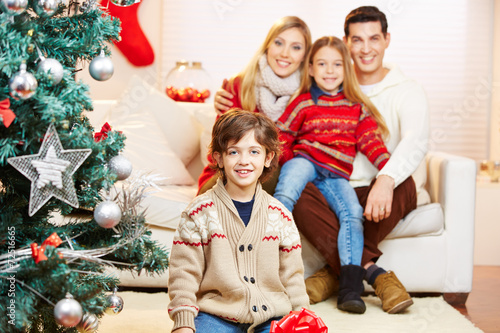 Familie zu Weihnachten mit Geschenken am Weihnachtsbaum