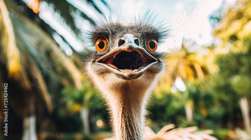 Artistic portrait of an ostrich in a studio setting showcasing detailed feathers and expressive eyes