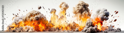 Dramatic fiery explosion with billowing smoke cloud against white background