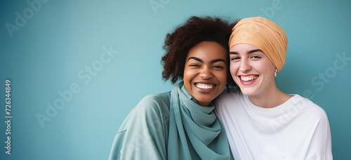 Cheerful young Black women in pink sweaters in front of baby blue background