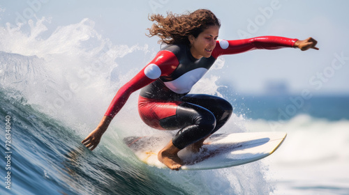 Female surfer catching waves in a red and black wetsuit on sunny day