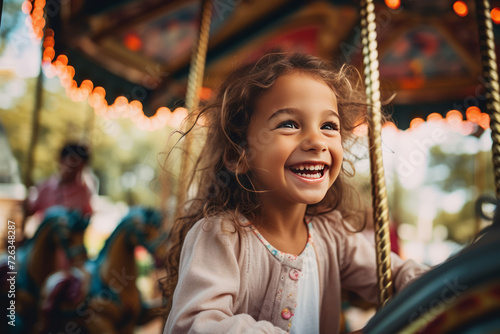 Joyful girl enjoying a merry-go-round ride at an amusement park