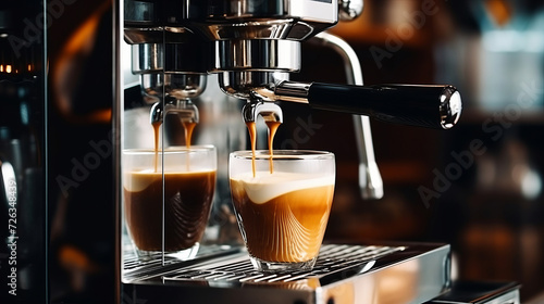 Espresso machine pouring fresh coffee into two cups in a café