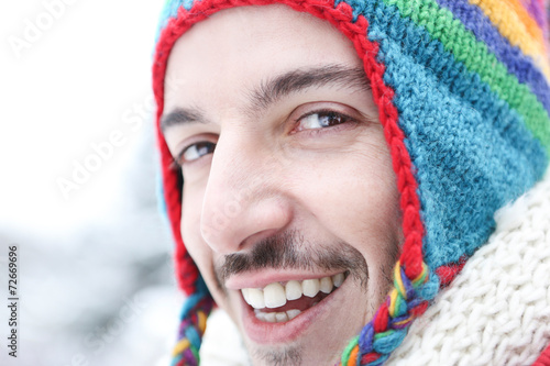 Portrait of an elderly Southeast Asian woman with a vibrant scarf and serene expression in a studio setting with a blue background