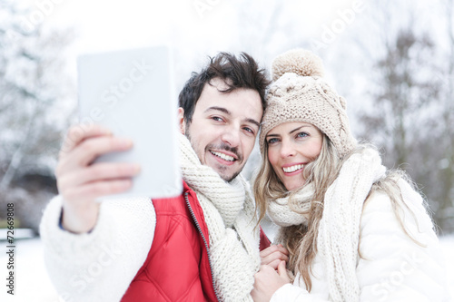 Paar im Winterurlaub macht Fotos mit Tablet Computer