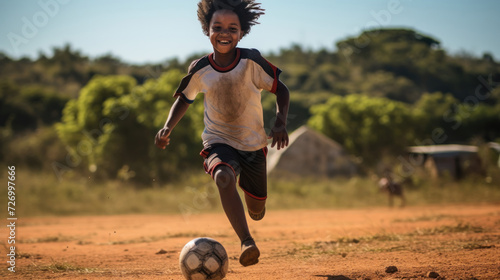 Joyful african child playing soccer on dusty field with radiant smile