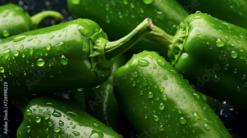 Fresh green bell peppers with water droplets close-up