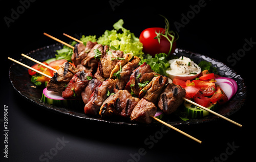 Grilled beef skewers with vegetables and spices on dark background