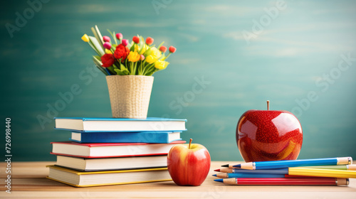 Colorful stationery set with books, pencils, apple, and graduation hat
