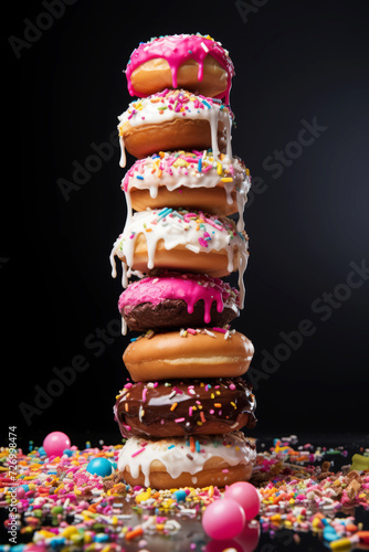 Colorful stacked donuts with sprinkles on dark background