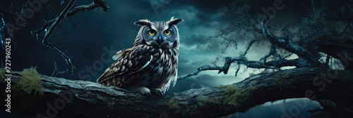 Serene owl perched on a mossy branch with a full moon in the twilight sky