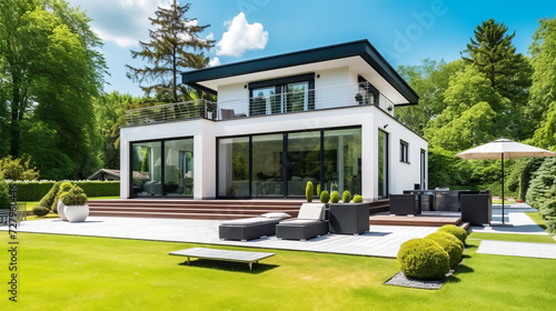 Modern luxury house with spacious lawn and garden on sunny day