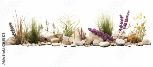 Tranquil rock garden with assorted plants on white background