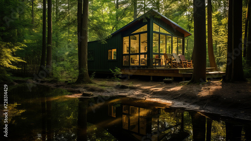 Secluded cabin in forest with reflecting pond at sunset