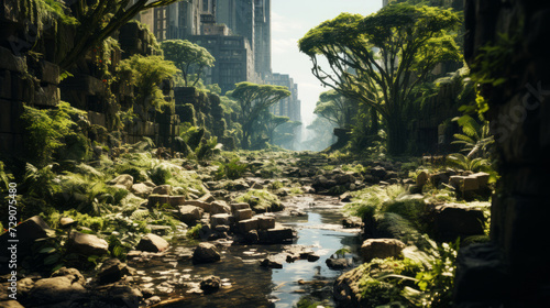 Post-apocalyptic city reclaimed by nature with lush greenery