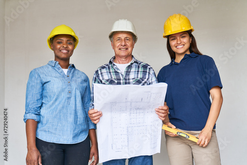 Portrait of smiling female construction workers and senior male contractor standing with blueprint design at incomplete house