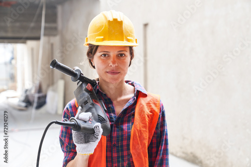 Portrait of confident young female construction worker wearing workwear carrying equipment at site