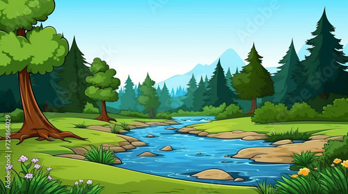 Enchanting landscape with majestic mountains, lush forests, and tranquil river