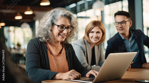 Happy middle-aged business professionals working together on a laptop in an office
