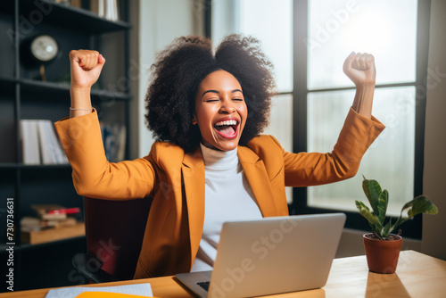 Ecstatic businesswoman celebrating success at her office desk