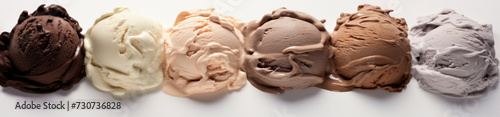 Top view of chocolate brownie ice cream scoop with chocolate sauce isolated on white background