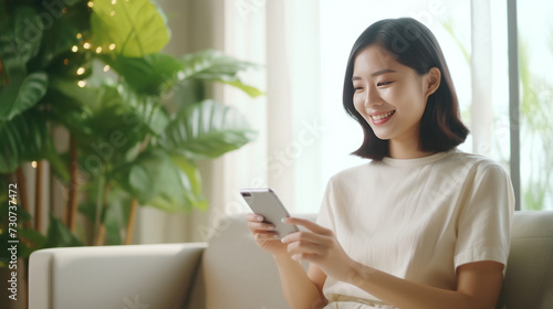 Senior woman using smartphone with smile in lively living room surrounded by indoor plants and modern art decor