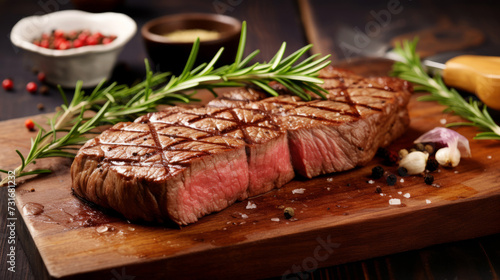 Juicy sliced grilled steak with fresh rosemary and knife on a wooden board, showcasing a delicious and flavorful meal preparation.