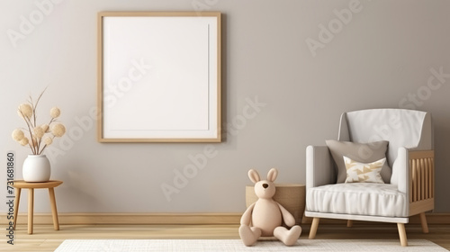 Modern cozy living room interior with empty frame, comfy chair and plush toy