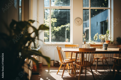 Cozy sunlit cafe interior with wooden chairs and green plants