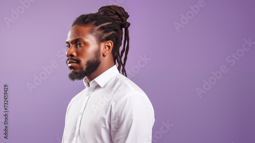 Stylish man with dreadlocks posing in a white shirt on a violet background
