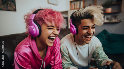 Two friends enjoying a competitive video game in a vibrant gaming room