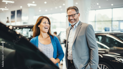 Happy couple laughing together in a car dealership showroom