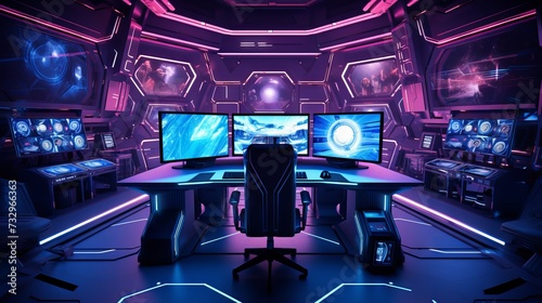 Modern HUD display monitors in futuristic control room (Generative AI)