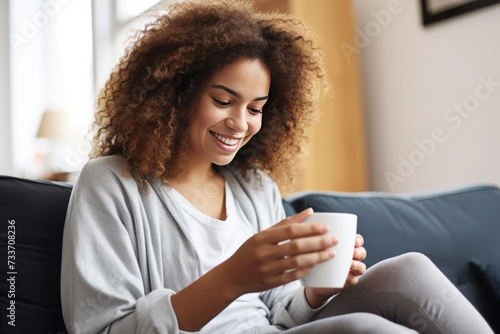 Smiling young woman enjoying a cozy moment with a warm drink at home