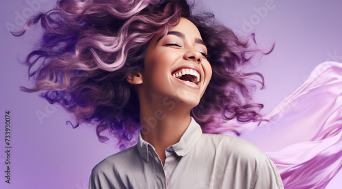 A joyful individual with vibrant rainbow-dyed curls and a radiant smile in colorful attire embodying happiness and creativity