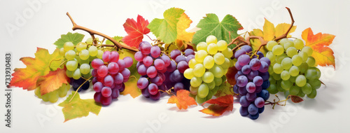 Colorful grape bunches hanging on vines with vibrant green leaves