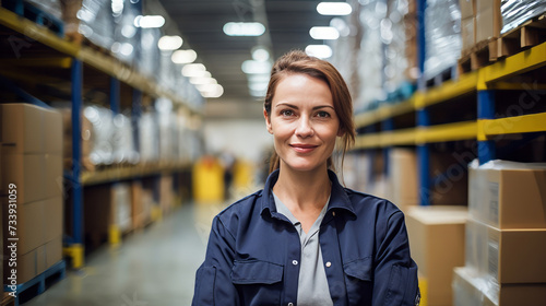 Confident female manager standing in a warehouse, overseeing logistics operations