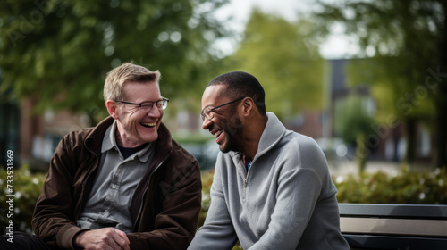 Two friends laughing and enjoying a relaxed conversation on a park bench