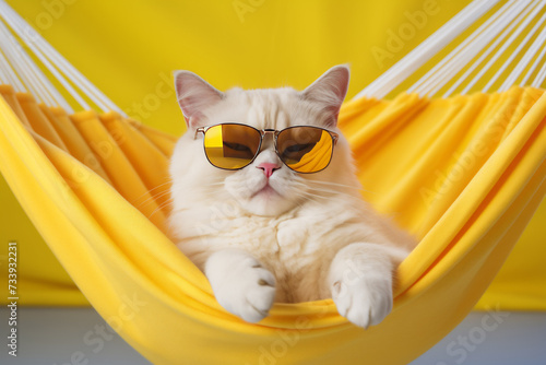 Relaxed white cat wearing sunglasses in a hammock against yellow