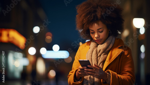 Young woman using smartphone in the city at night with bokeh lights
