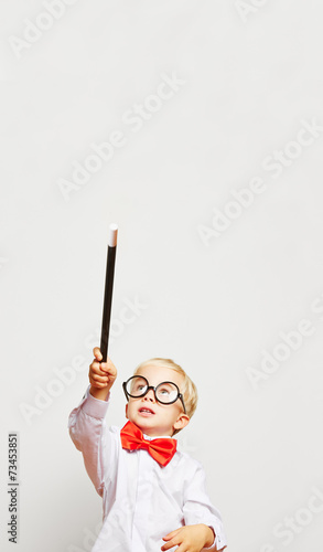 Kind als Zauberer hält Zauberstab in die Luft