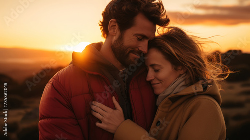 Loving couple embracing in warm sunset light with beautiful landscape backdrop